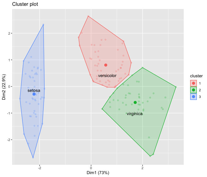 fviz_cluster(kms, data = df, alpha=0.2,shape=19,geom = "point")它输出以下图片: