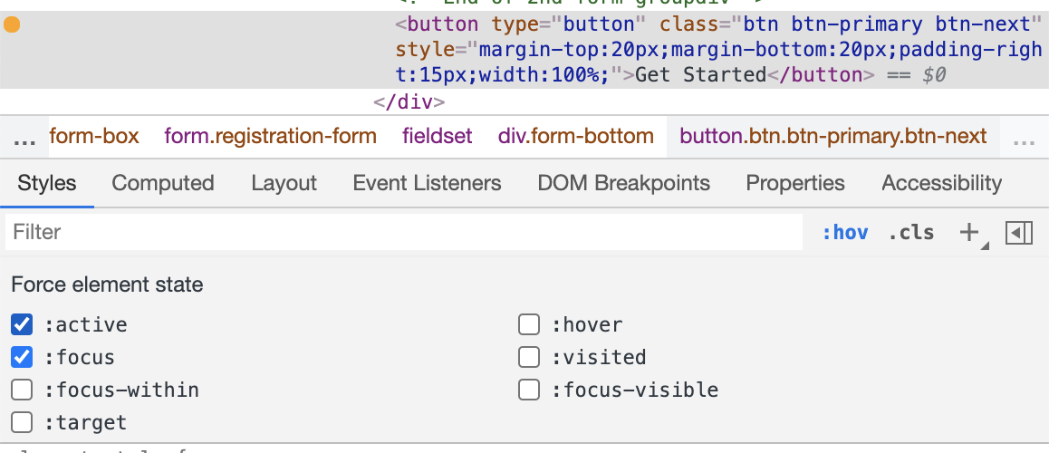 在Chrome检查器中,您可以切换按钮状态以进行调试。本文使用了两种方法的组合:active:focus