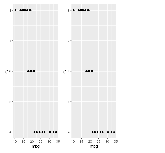 p <- ggplot(mtcars, aes(mpg, cyl)) + geom_point()