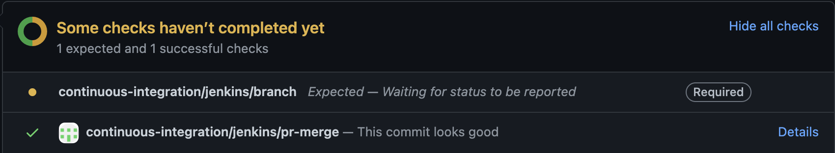 当发生上述问题时,根据我的观察,有时状态不是"continuous-integration/jenkins/branch"更新的,有时是"continuous-integration/jenkins/pr-merge"状态检查的更新。