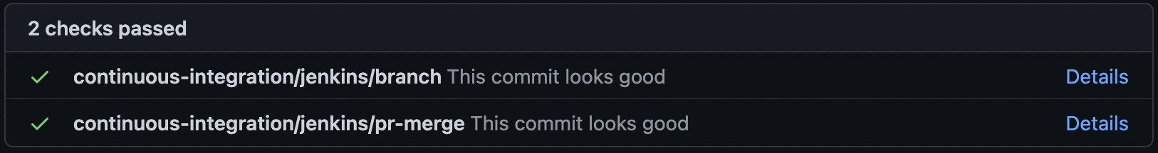 我将Jenkins与部署在EKS集群上的版本"2.263.1"一起使用。我已经在詹金斯设置了一个网络钩子,并在回购中添加了的“分支保护规则”,用于公关和分支状态检查。集成是有效的,并能够得到更新的状态检查在GitHub的每一个公关我们提出。