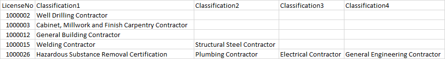 # LicenseNo Classification1 Classification2 Classification3 Classification4 Classification5 Classification6 Classification7