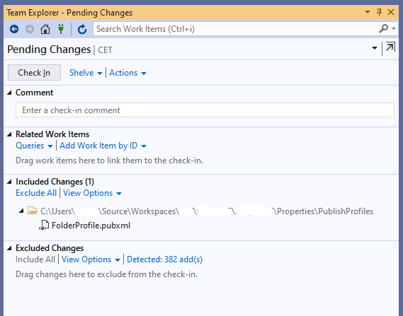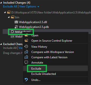 虽然我从解决方案资源管理器中排除了所有Properties/PublishProfiles/XXX.pubxml文件,但它们仍然在等待签入的列表中: