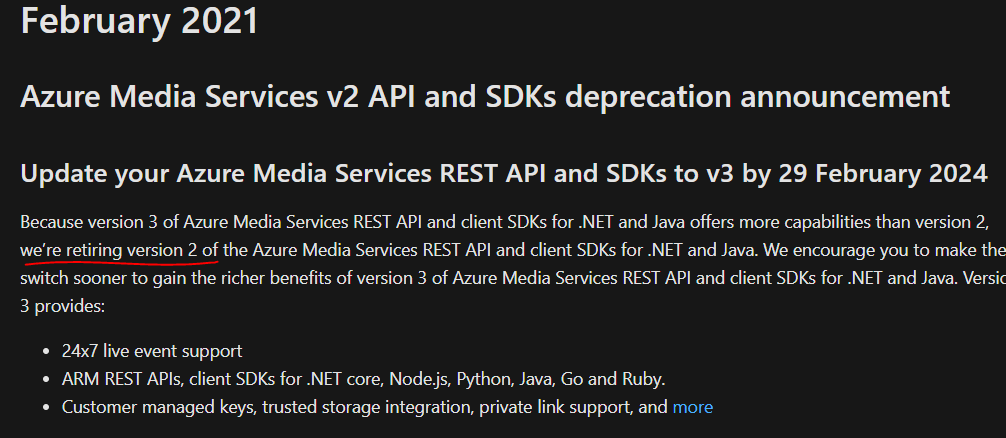在2024年2月29日之前将Azure媒体服务REST和SDK更新为v3