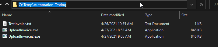C:\Temp\Automation-Testing\UploadInvoice2.exe "C:\Temp\Automation-Testing\TestInvoice.txt"指向该文件夹中的现有文件: