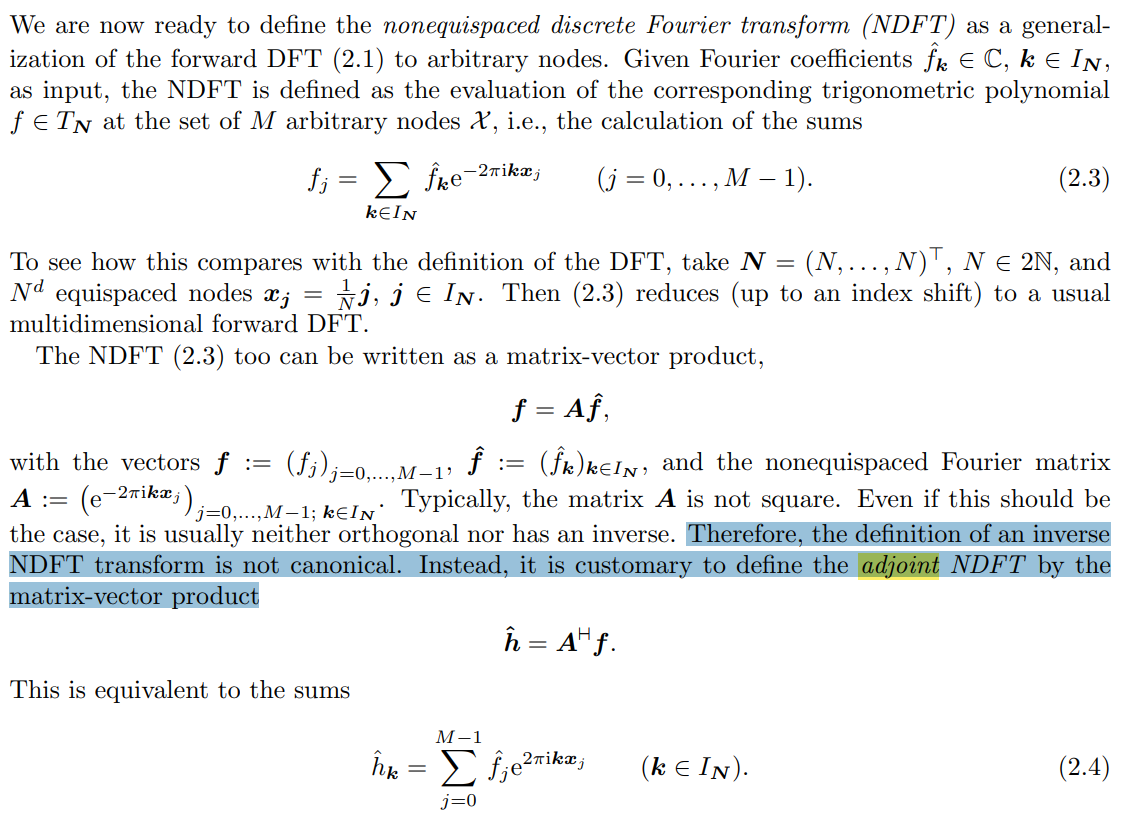 ndft是f_hat @ np.exp(-2j * np.pi * x * k[:, None]),ndft_adjoint是f @ np.exp(2j * np.pi * k * x[:, None])