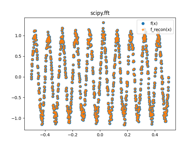 注意f_recon有多吵。我们可以用非均匀采样信号来解释f_k的差估计。还有一个符号错误,当我们比较f_k的两个估计值时,我们已经可以观察到这个错误。这来自于伴随的NFFT,指数中的符号与逆DFT相同,这实际上意味着f_recon是翻转的w.r.t。x。