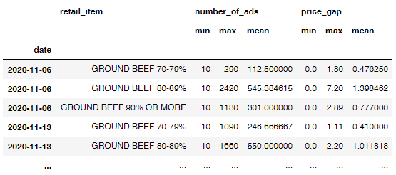 df_gbeef_agg = (df_gbeef.groupby(['date', 'retail_item']).agg(agg_dict)