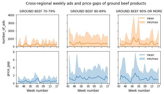 fig.suptitle('Cross-regional weekly ads and price gaps of ground beef products',