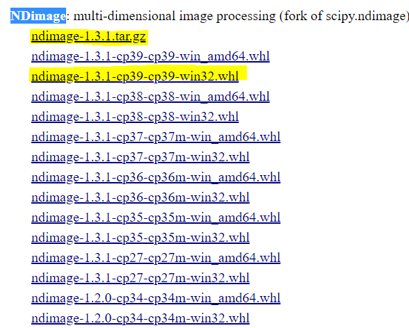 现在对于您的平台python 3.7,它应该是ndimage‑1.3.1‑cp37‑cp37m‑win_amd64.whl或ndimage‑1.3.1‑cp37‑cp37m‑win32.whl