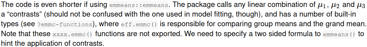 emmeans(fit.sum, specs = eff ~ f) ## identical to above在这里,使用specs = ~f或specs = "f",只报告$emmeans (边缘均值)组件。左手边的"eff“表示要调用eff.emmc()来应用对比,而$contrasts组件提供了这样的结果。