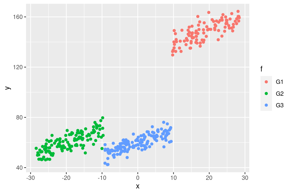 ggplot(data = dat, mapping = aes(x = x, y = y, colour = f)) + geom_point()