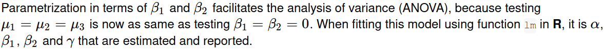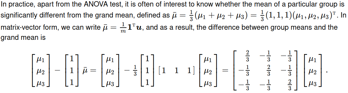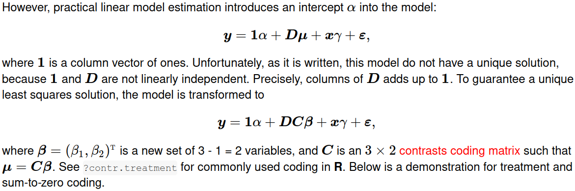我们不能通过对比编码来达到这个目的。在单向方差分析中,对比被用来将N级因子编码为N1变量,再加上一个截距,所以N个变量仍然是N个变量。但是,在模型中同时考虑群均值的大均值和偏差,是从N个变量到N+1变量的再参数化。这(即使我们找到了一种方法)使得设计矩阵缺乏秩,而lm/aov/glm,等则会将一个变量放入NA。