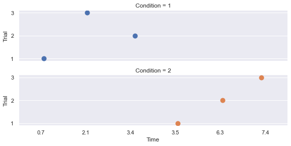 sns.catplot(x='Time', y='Trial', row='Condition', hue='Condition',
