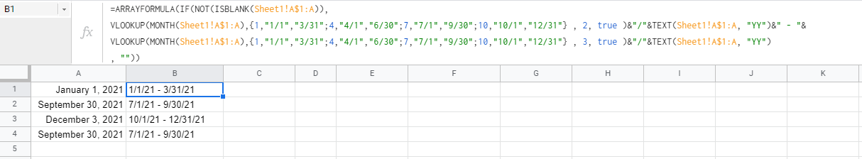 VLOOKUP(MONTH(Sheet1!A$1:A),{1,"1/1","3/31";4,"4/1","6/30";7,"7/1","9/30";10,"10/1","12/31"} , 2, true )&"/"&TEXT(Sheet1!A$1:A, "YY")&" - "&