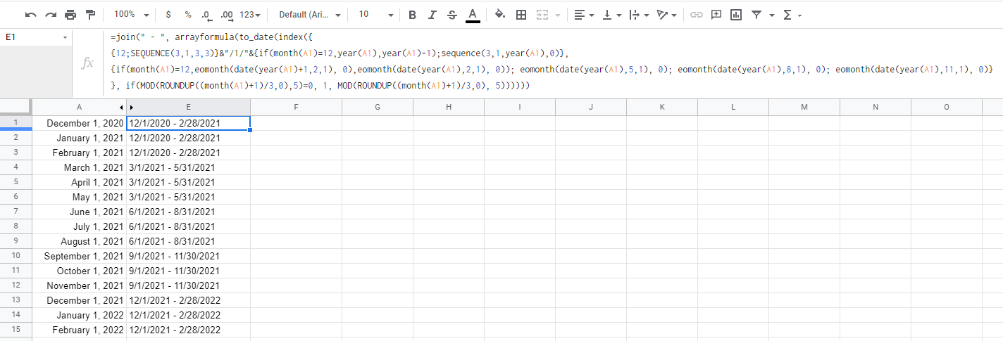 YEAR('Sheet1'!A$2:A)&"-Q"&VLOOKUP(MONTH('Sheet1'!A$2:A),{1,1;4,2;7,3;10,4} 我如何定制它来具体地拉动:3/1/21 - 5/31/21或3/1/21 - 5/31/21,6/1/21 - 8/31/21,9/1/21 - 11/31/21,等等。