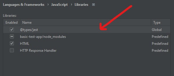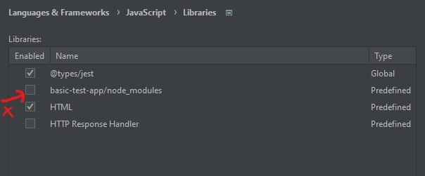 但是,如果我取消选中项目的node_modules库,Jest类型定义就会恢复。
