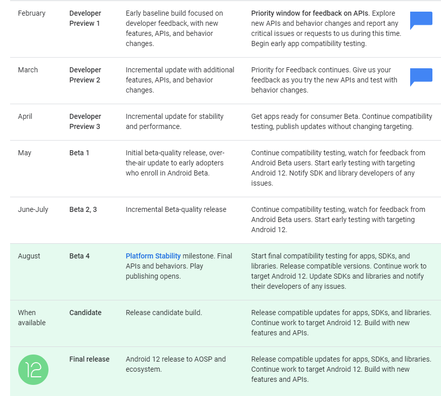Android12Preview程序从2021年2月开始运行,直到AOSP和OEM的最终公开发行,计划在今年晚些时候发布。在关键的开发里程碑上,我们将为您的开发和测试环境提供更新。每个都包括SDK工具、系统映像、模拟器、API引用和API差异。