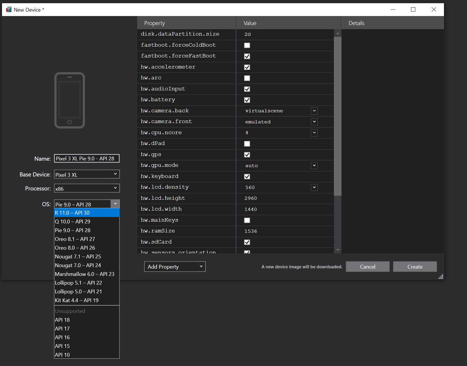 但是,当我尝试在设备管理器中创建仿真设备时,我没有在列表中看到这个API