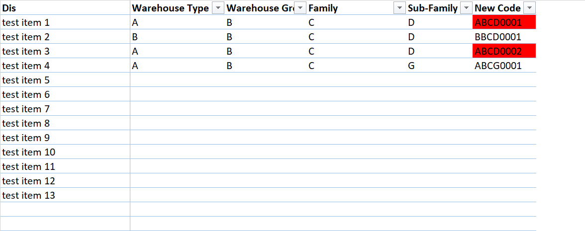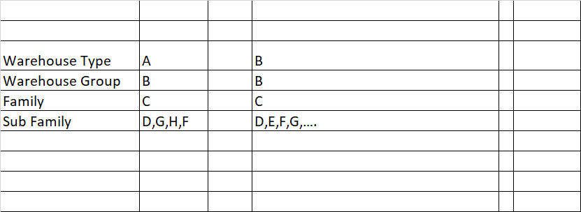 我构建了一个结构(4个字母,4个数字)(仓库类型,仓库组,家庭,子家族),如果在仓库类型(A ),仓库组(B ),家庭(C),子家族(D)中的项目添加了4个序号,