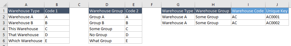 创建4个查找表(对于示例,我为左边看到的仓库类型和组创建了两个)。然后为每个类型、组等应用您希望拥有的映射。