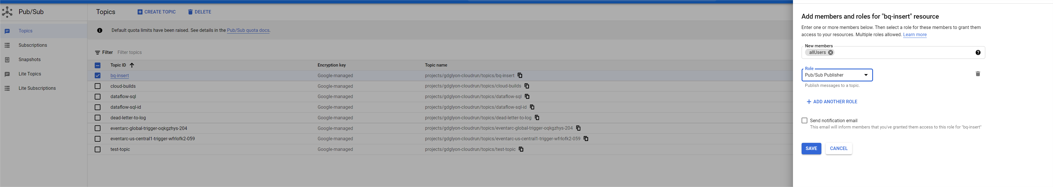 其中一个不好的,可能的做法,是设置allUsers授权访问您的资源。这里有一个带有PubSub主题的示例