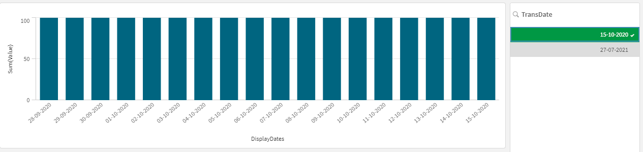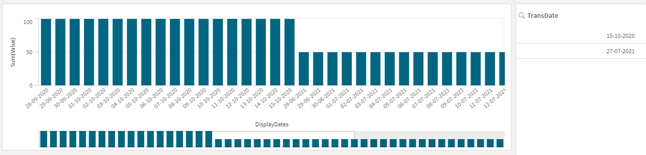 如果我们构造一个简单的条形图(以DisplayDates为维度,以sum(Value)为度量),而不应用任何选择: