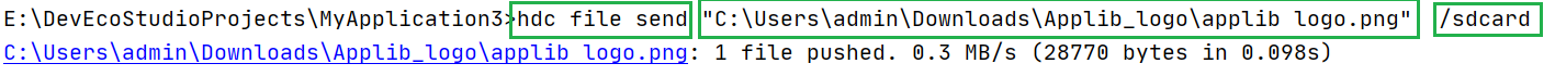 hdc file send命令。终端将在执行后显示成功或失败的消息。hdc file send [LOCAL file path of computer] [REMOTE location in device]