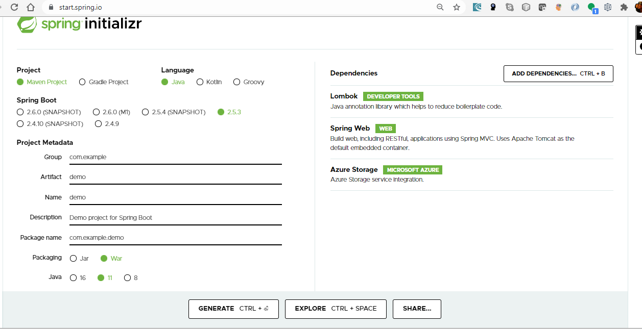 我开始学习Java + SprintBoot + AzureStorage。我刚刚使用以下配置通过Spring初始化程序创建了一个项目: