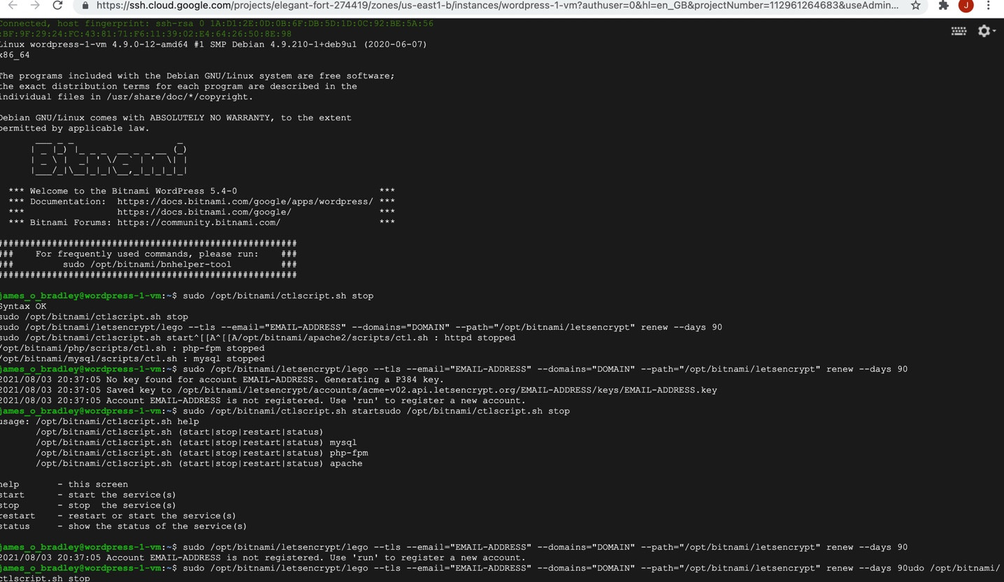 所以我进入了我的谷歌云和ssl到我的服务器。我认为这可能是一个过时的证书,我输入了一个错误的命令(见照片附件-我没有包括我的实际电子邮件和域名愚蠢,复制和粘贴从互联网)。现在,我收到一个错误,说mysql不工作。我想可能也有太空问题。