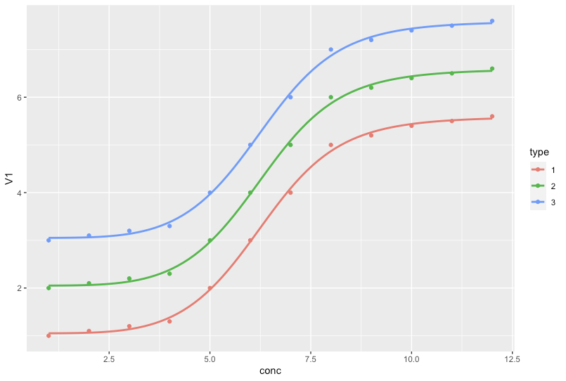 geom_smooth(method = drm, method.args = list(fct = LL.5()), se = FALSE)结果: