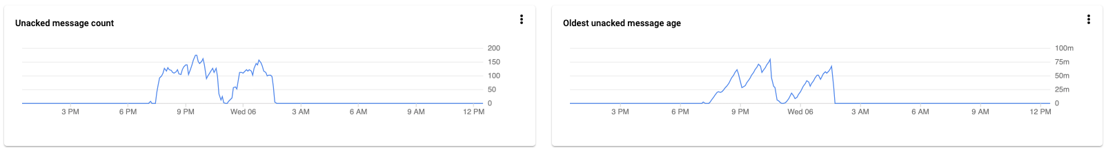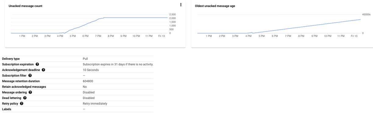 理想的解决方案是简单地改变重试策略。当使用“指数后退延迟后重试”时,Pub/Sub 即使在最大指数延迟 (600秒)之后也会继续重试。这样,您就可以在Pub/Sub中获得很多消息,并通过一些云函数来缓慢地处理它们--这符合我们对速率限制的需要。