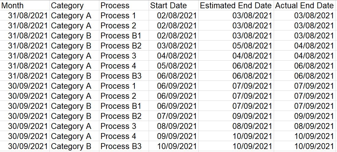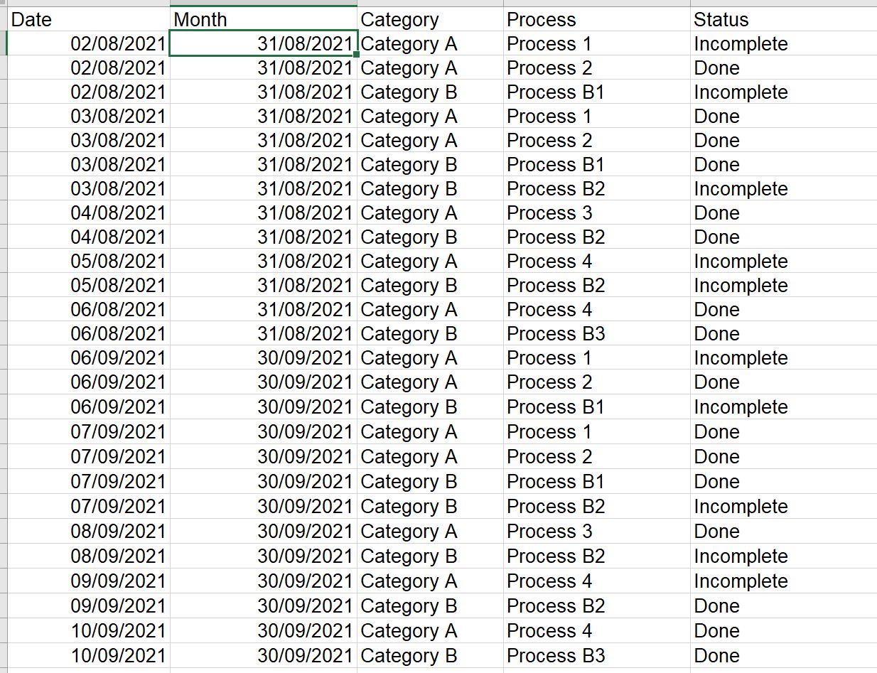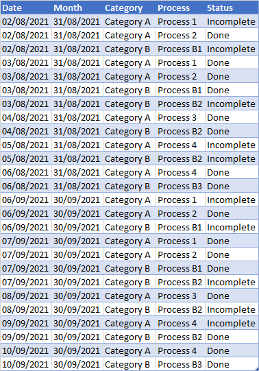 #"Grouped Rows" = Table.Group(#"Changed Type", {"Month", "Category", "Process"}, {