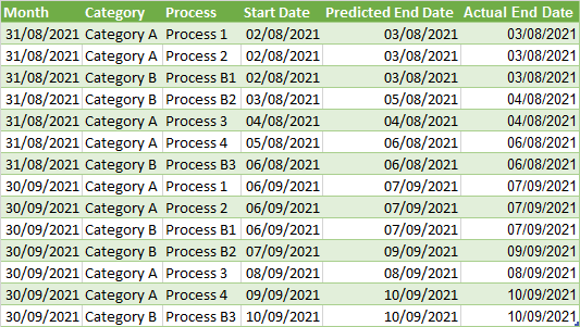 数据包含每个销售类别的流程,如果生产过程已经完成或没有完成,则为每个销售类别提供状态。需要一个具有三个计算列的新聚合表,该表返回以下日期: