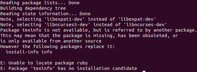 我正在尝试安装node.js和npm,在安装它们之前,它需要安装Ruby和GCC,所以在安装Ruby和GCC时需要使用以下cmmand:sudo apt-get install build-essential curl git m4 ruby texinfo libbz2-dev libcurl4-openssl-dev libexpat-dev libncurses-dev zlib1g-dev in Ubuntu16.04.6LTS,xenial。我知道错误: