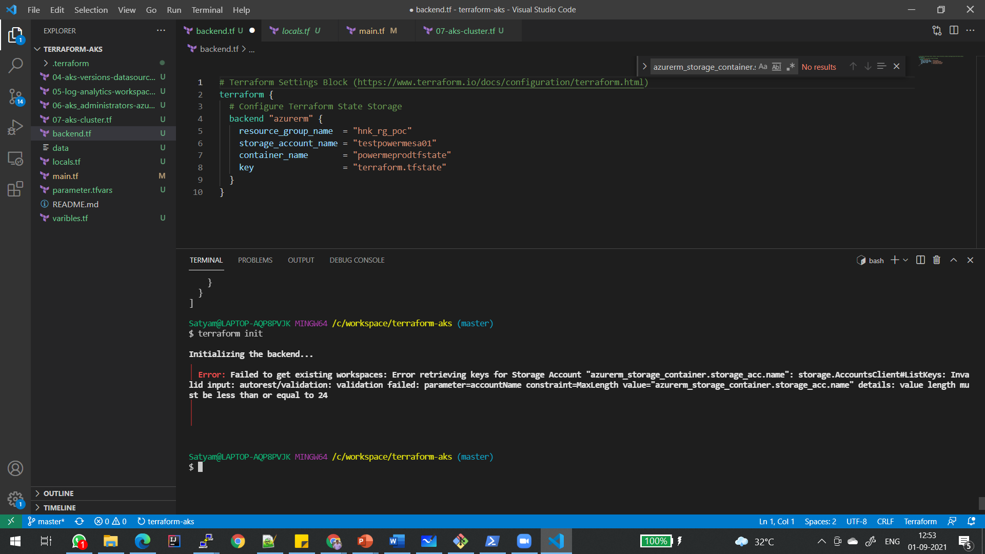 错误加载状态:错误检索存储帐户“azurerm_resource_group.aks_rg.name”的键: storage.AccountsClient#ListKeys:无效输入:自动休息/验证:验证失败: parameter=accountName constraint=MaxLength value="azurerm_resource_group.aks_rg.name“详细信息:值长度必须小于或等于24│