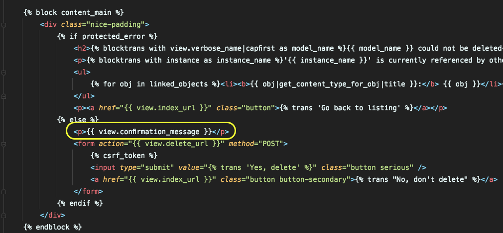 return "This member has %d sprockets. Are you sure you want to delete?" % sprocket_count然后,在该模型的ModelAdmin配置中,将自定义子类指定为delete_view_class。