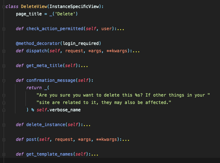 return super(self.__class__, self).delete(*args, **kwargs)这是来自wagtail的默认确认消息:它位于wagtail -> cont肋骨-> modeladmin -> views.py中。