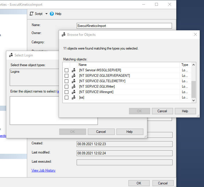 右键单击“作业”>“属性”>“常规”>“所有者”,然后在那里更改所有者。如果您的用户访问远程服务器并执行,请设置您的用户。