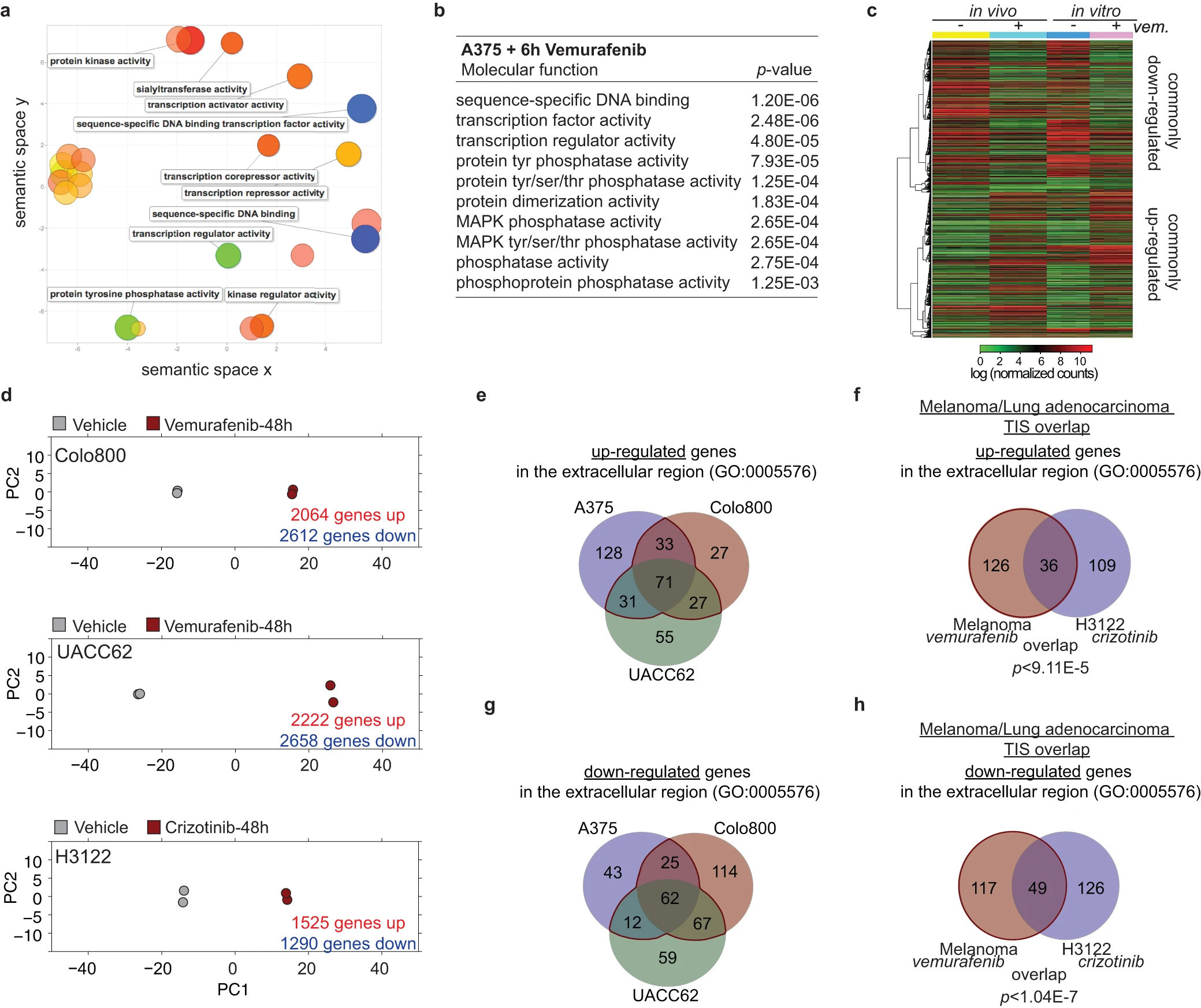 (图3a,b,扩展数据图3a,b及补充表1)。48h后,1/3以上的转录组差异表达(>5,000个基因;405个编码胞外区蛋白质的基因,基因本体(GO)登录0005576),与维穆拉非尼治疗5天后体内A375肿瘤的基因表达变化明显重叠(图3a,b和扩展数据图3c)。Colo800和UACC62黑色素瘤细胞在维母拉非尼和H3122肺腺癌细胞中也有类似的广泛表达。尽管有不同的细胞来源、不同的致癌因素和不同的靶向治疗,但黑色素瘤分泌体与肺腺癌细胞之间仍有明显的重叠(P < 9.11×10−5)。