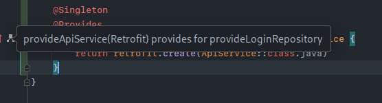 error: [Dagger/MissingBinding] LoginRepository cannot be provided without an @Provides-annotated method.起初,存储库似乎无法注入,但我已经将其指向ApiService,因为如果我从provideLoginRepository方法参数中删除它,它将成功构建。