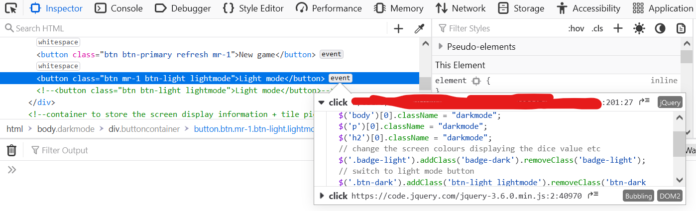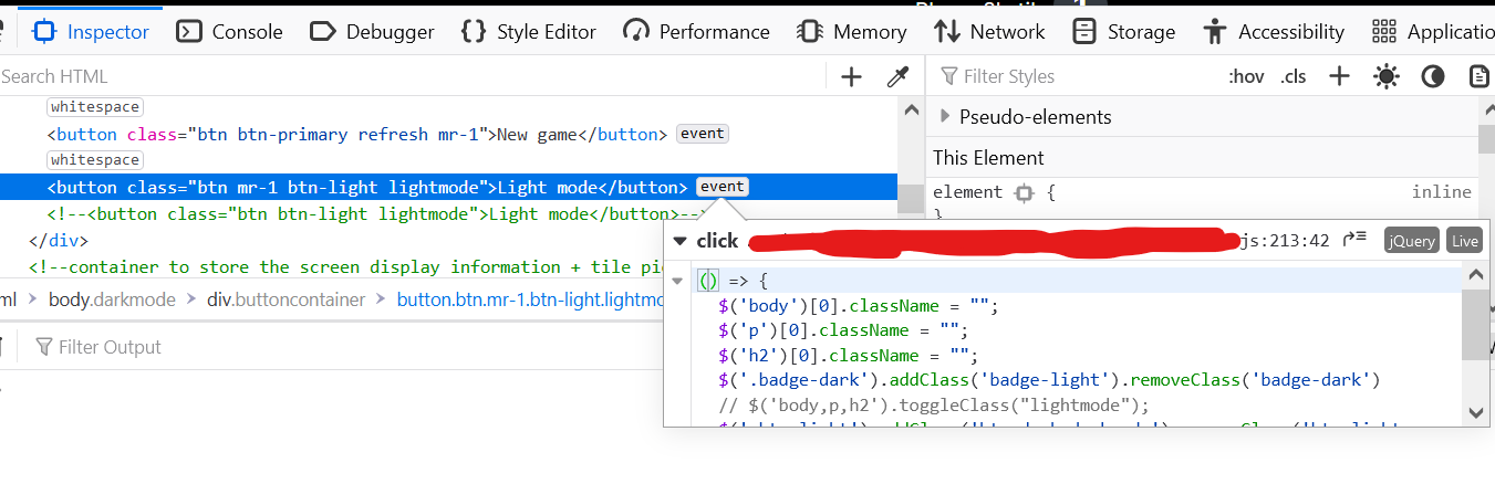 <button class="btn btn-dark darkmode mr-1">Dark mode</button>我怀疑这个错误是否与站点没有读取轻模函数有关?毕竟,当我检查控制台时,我看到这个类已经成功地更新了,所以lightmode类已经出现了,只是单击仍然注册上一个黑模式类吗?我以前从未遇到过这样的问题,我不知道这是什么类型的错误,所以我无法找到正确的答案。