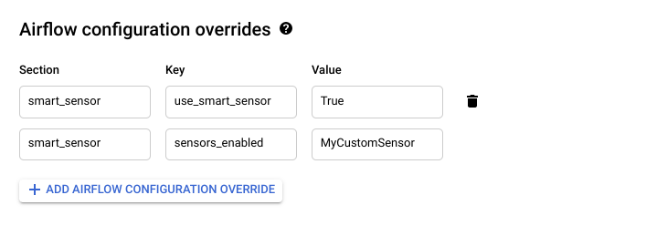 当我在现有Composer实例上使用命令sensors_enabled和use_smart_sensor更新gcloud composer environments update和use_smart_sensor值时,我能够使用代码再现您的错误。看起来Composer没有在运行时应用新的配置。