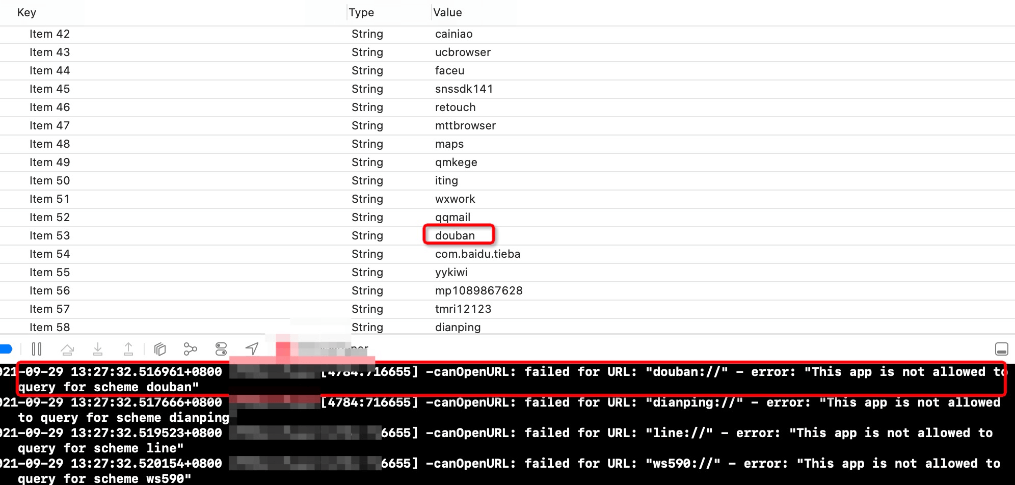 我已经在LSApplicationQueriesSchemes中添加了xxxx,但是我仍然得到了这个错误,我测试了更改LSApplicationQueriesSchemes中包含的urlscheme的位置或减少了urlscheme的数量,发现LSApplicationQueriesSchemes的前35个左右运行良好,在此之后的前35个左右将提示此错误。我不知道这是xcode13中的一个bug还是ios15的问题,它仍然是不正确的。