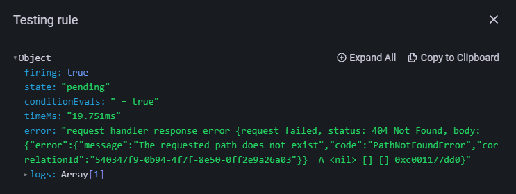 我试图在grafana中为图形(旧的)创建警告规则,但得到执行错误。