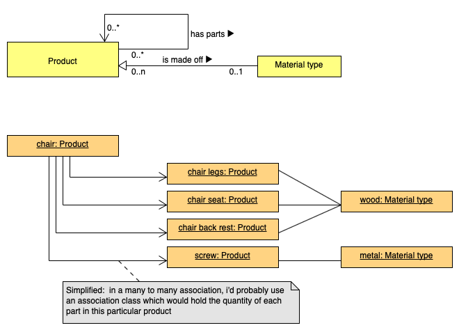 我不认为任何“由”组成的是由某种静态的关系所代表的。要做一张木椅,只需在木头上做Depends。这里没有其他的关系,因为你有一些复杂的过程,把木头变成椅子。或者一棵树变成纸。或者你的其他选择。为了描述这种关系,您需要描述这个过程。这是可能的使用活动。您也可以使用UML来消除物理组件。但这会让我们远离你的问题.