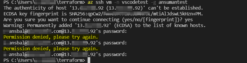 我们试图在Azure中使用特定于项目的VM来实现远程开发模型,并允许用户使用Azure AD身份验证和MFA从VS代码中进行连接。它很适合公钥,但不适合Azure AD身份验证。