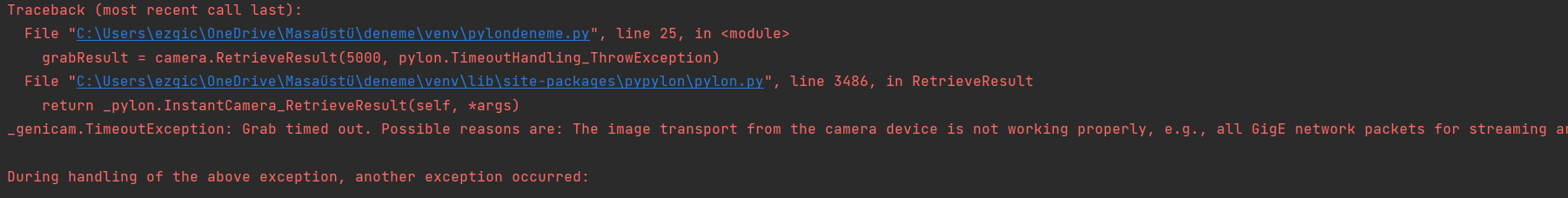 我使用了来自Github basler/pypylon/grab.py的pypylon的grab.py代码。当我在另一台计算机上尝试它时,它可以工作,但是它会在我的计算机上抛出一个超时异常。你能帮我解决这个问题吗?