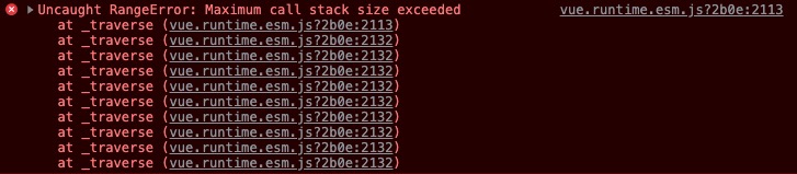 这个答案指向了我正确的方向:maximum calstack size exceeded on vuex commit