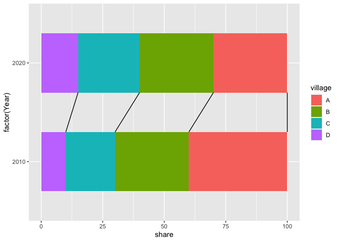 df_input <- data.frame( Year= c(2010,2010,2010,2010,2020,2020,2020,2020), village= c("A","B","C","D","A","B","C","D"), share = c(40,30,20,10,30,30,25,15))